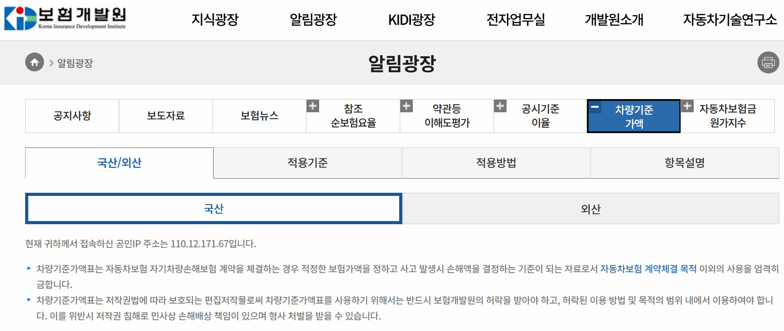 보험개발원 홈페이지 또는 차량가액 조회 전용 시스템을 통해 간단히 확인할 수 있습니다.