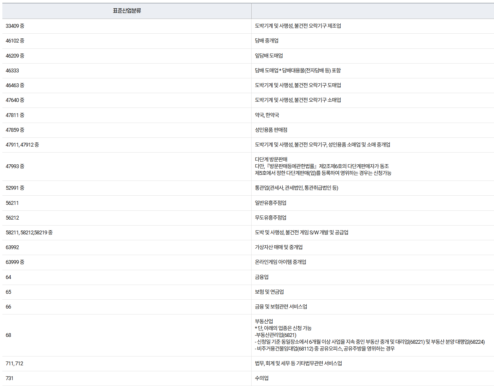 - 기존 지원과의 중복 방지: 이미 다른 정부 지원 프로그램이나 정책의 혜택을 받고 있는 업종은 중복 지원을 방지하기 위해 정책자금 지원 대상에서 제외될 수 있습니다.