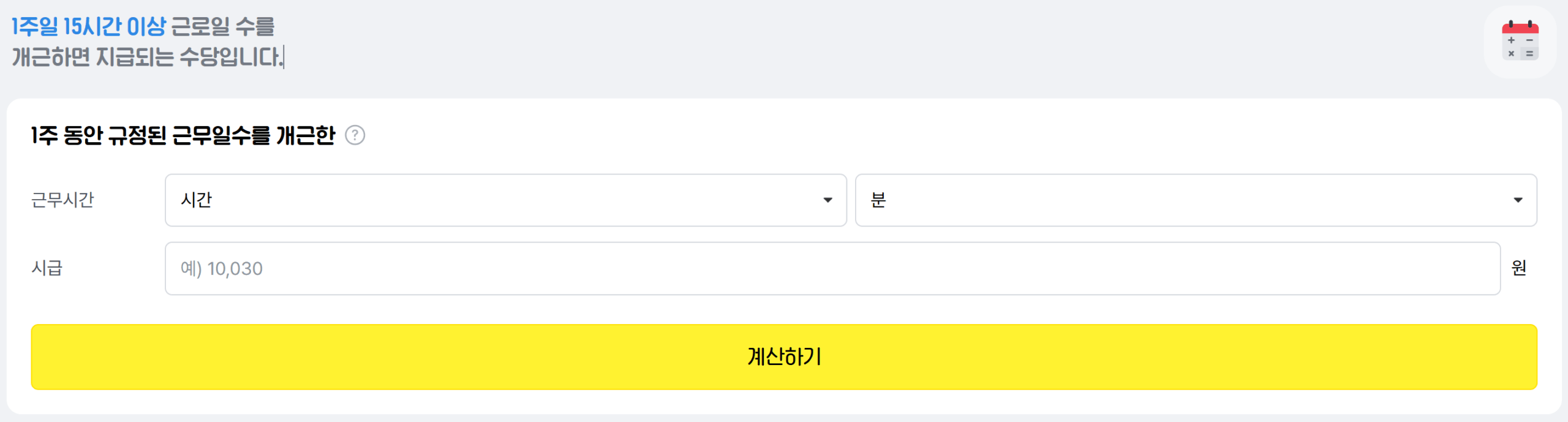 - 계산 결과 확인: ‘계산하기’ 버튼을 누르면 해당 주에 받을 수 있는 예상 주휴수당 금액을 즉시 확인할 수 있습니다.