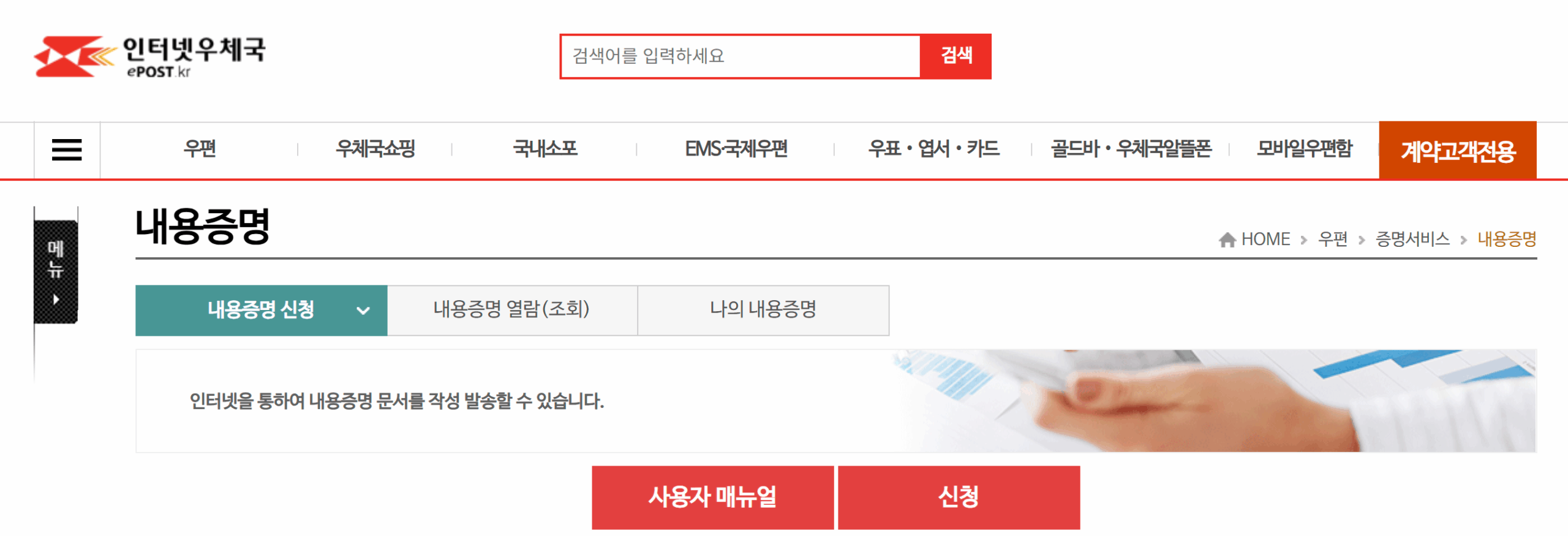 - 인터넷 우체국 접속 → 내용증명 메뉴 이용